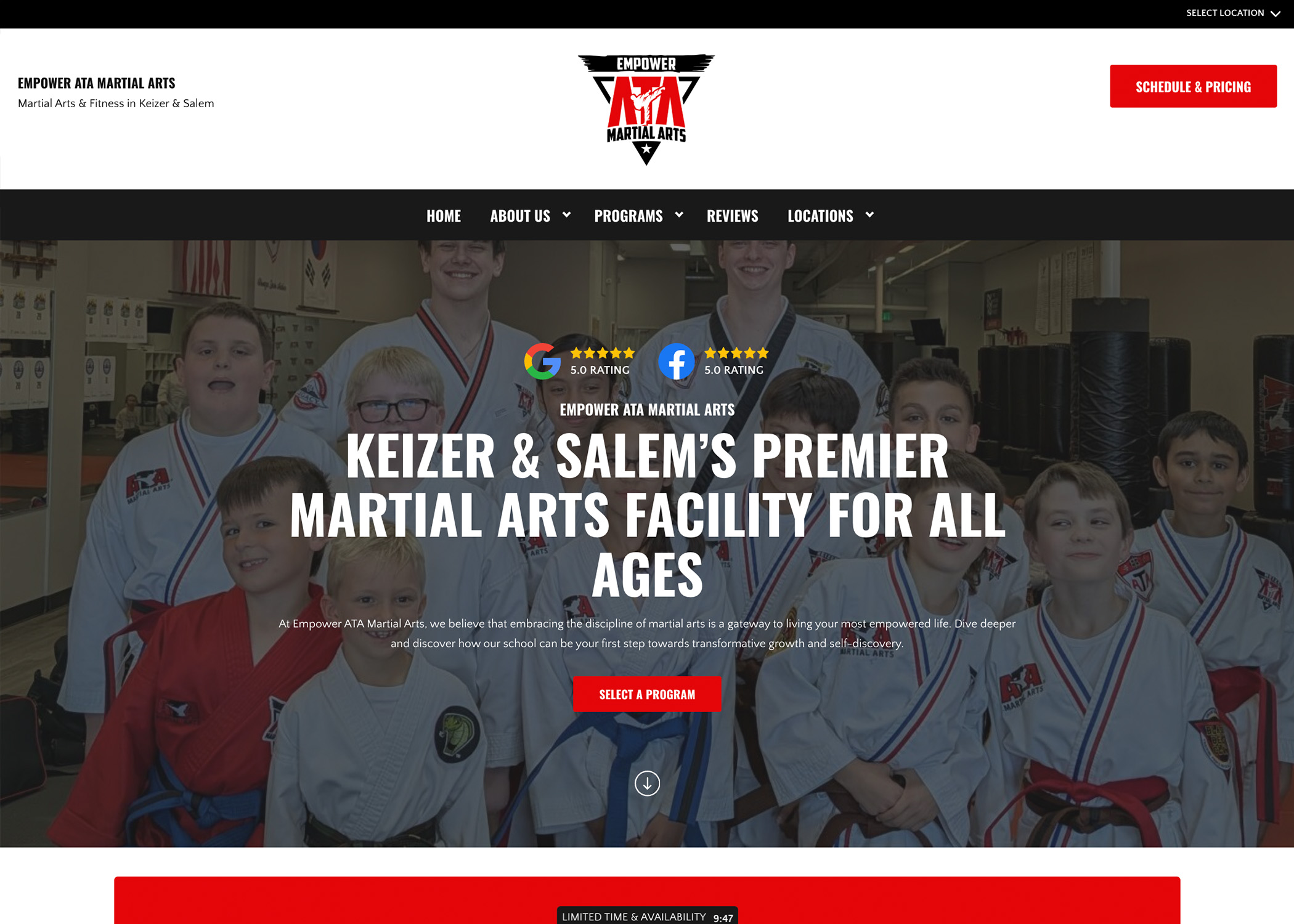 Empower ATA’s site exemplifies what modern martial arts marketing should feel like in 2026: high-touch, emotionally intelligent, and parent-focused.