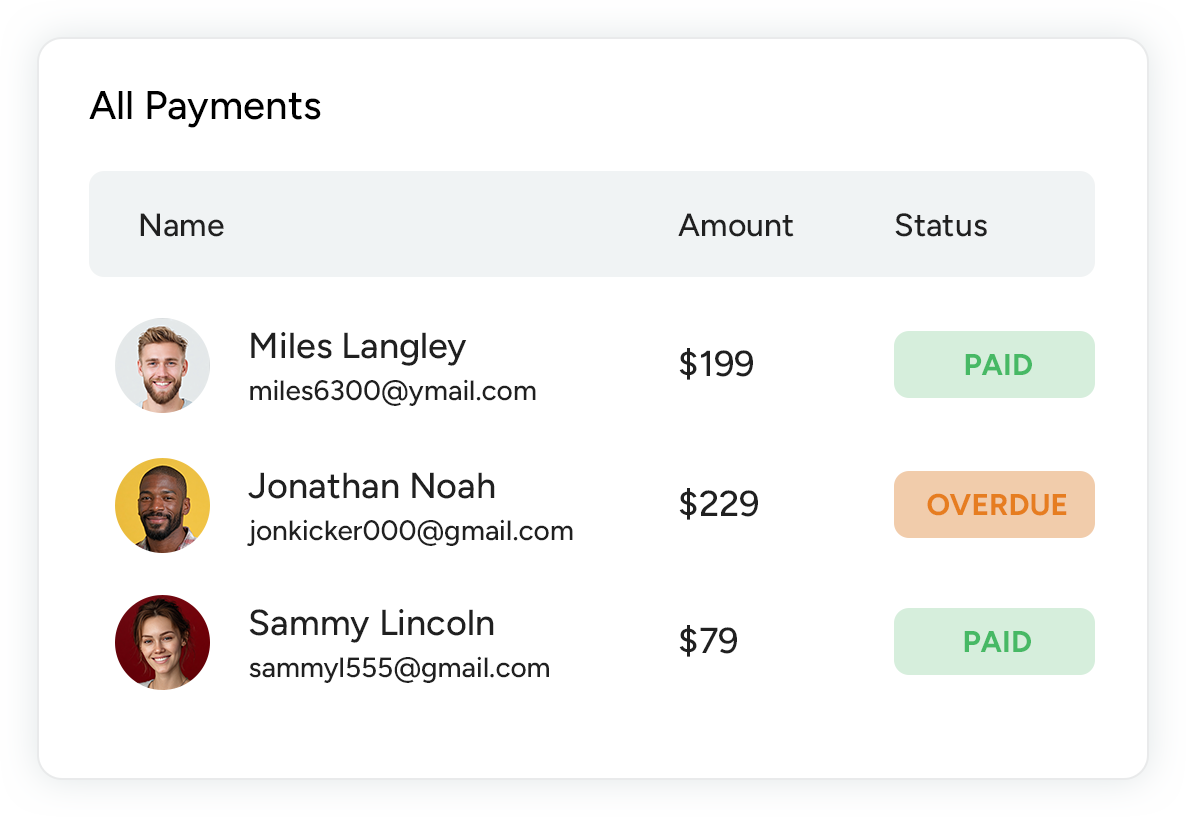 Know exactly who’s paid and who hasn’t with real-time visibility into payment history, overdue accounts, and upcoming charges — all in one clean dashboard.