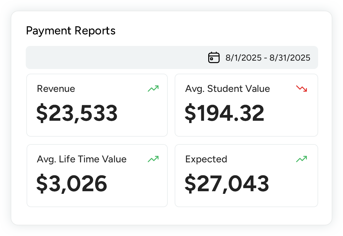 Automated billing cuts down on manual entry and staff follow-ups. With payments and reporting handled in one place, your team can stay focused on what matters most: your students.