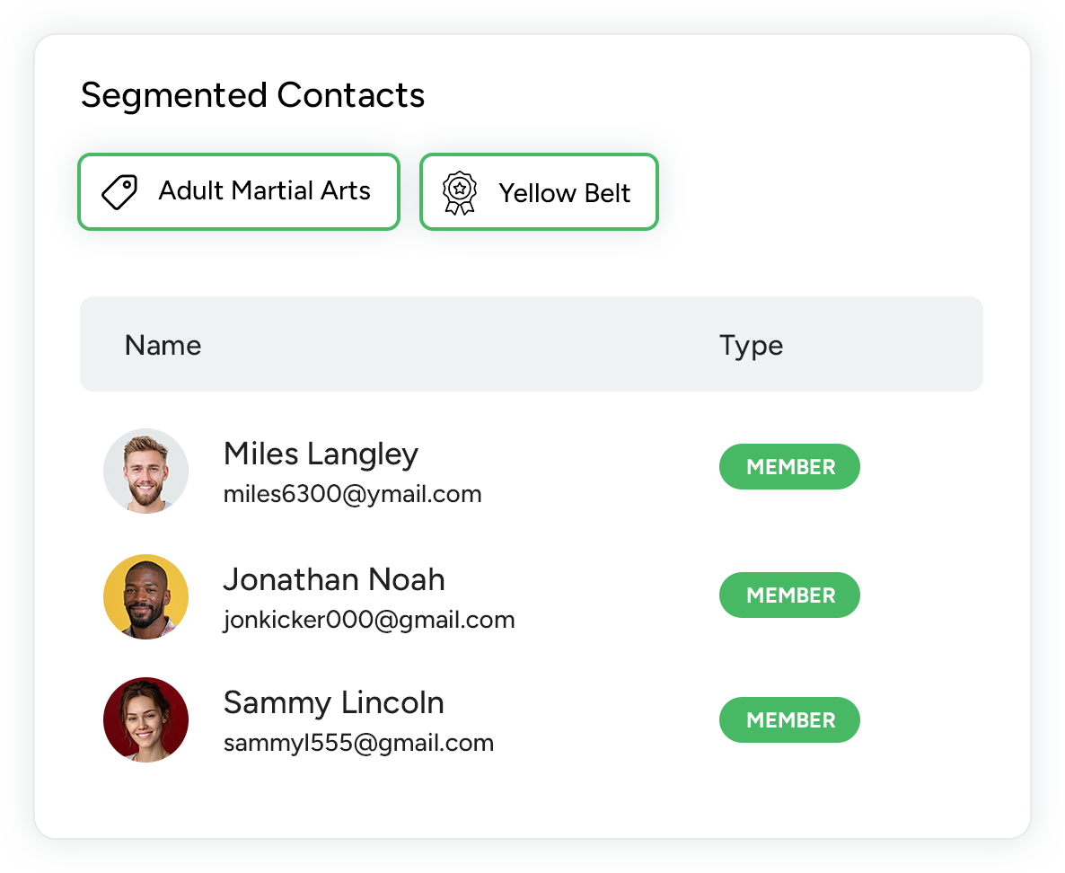 Use filters like lead source, tags, contact type, and even attendance behavior to segment your database in seconds. Run targeted campaigns or quickly find high-priority leads who are ready to join.